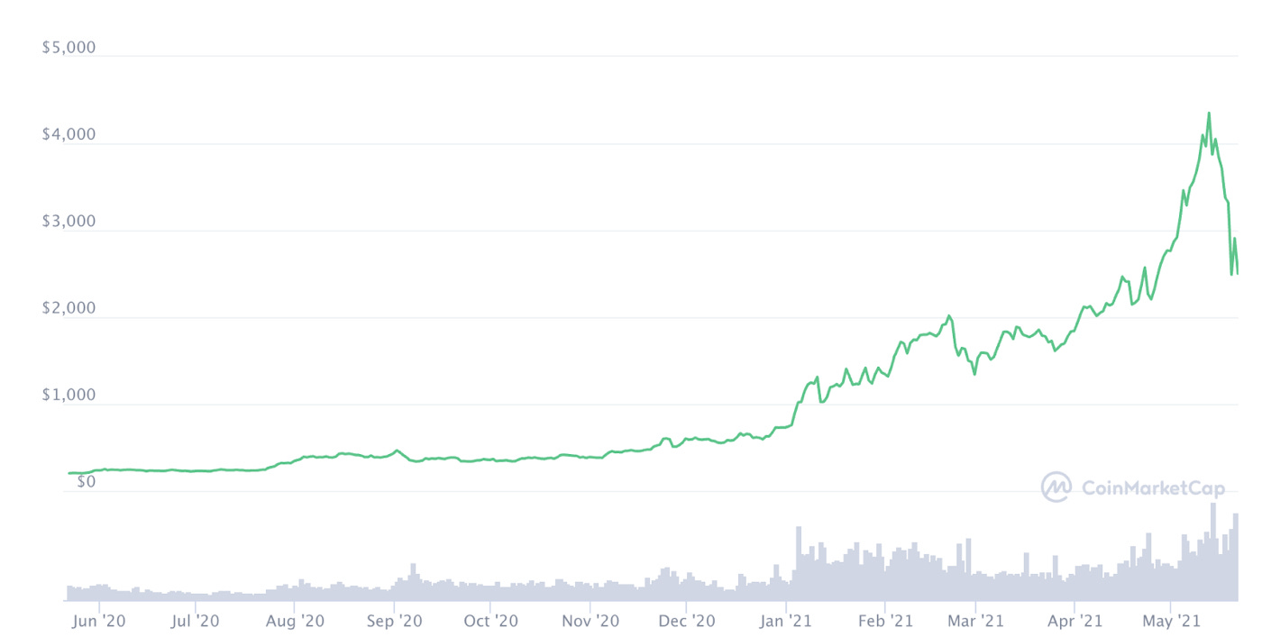 This is definitely an exciting week to start this newsletter. On Wednesday, Bitcoin dropped from its Tuesday high of ~$45,000 to a low of about $32,000. Ethereum fell from a high of $3,500 to a low of $2,100.
