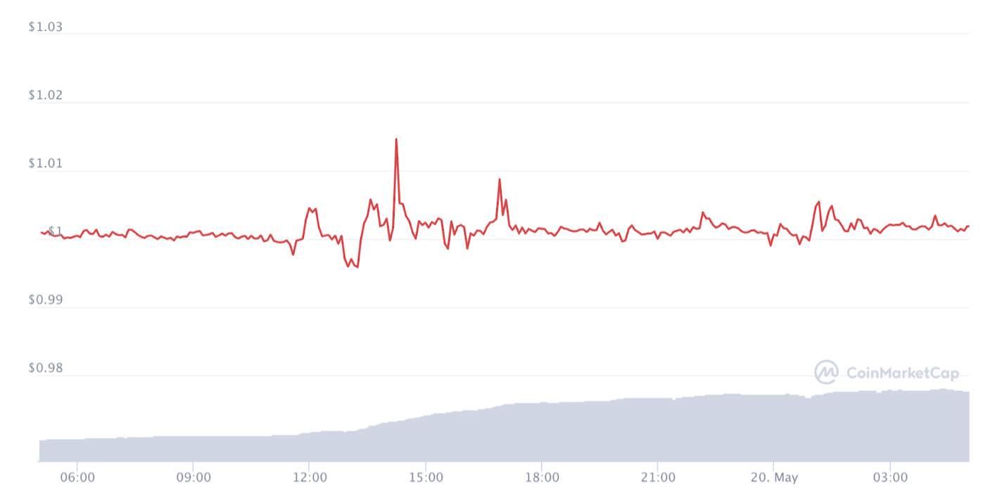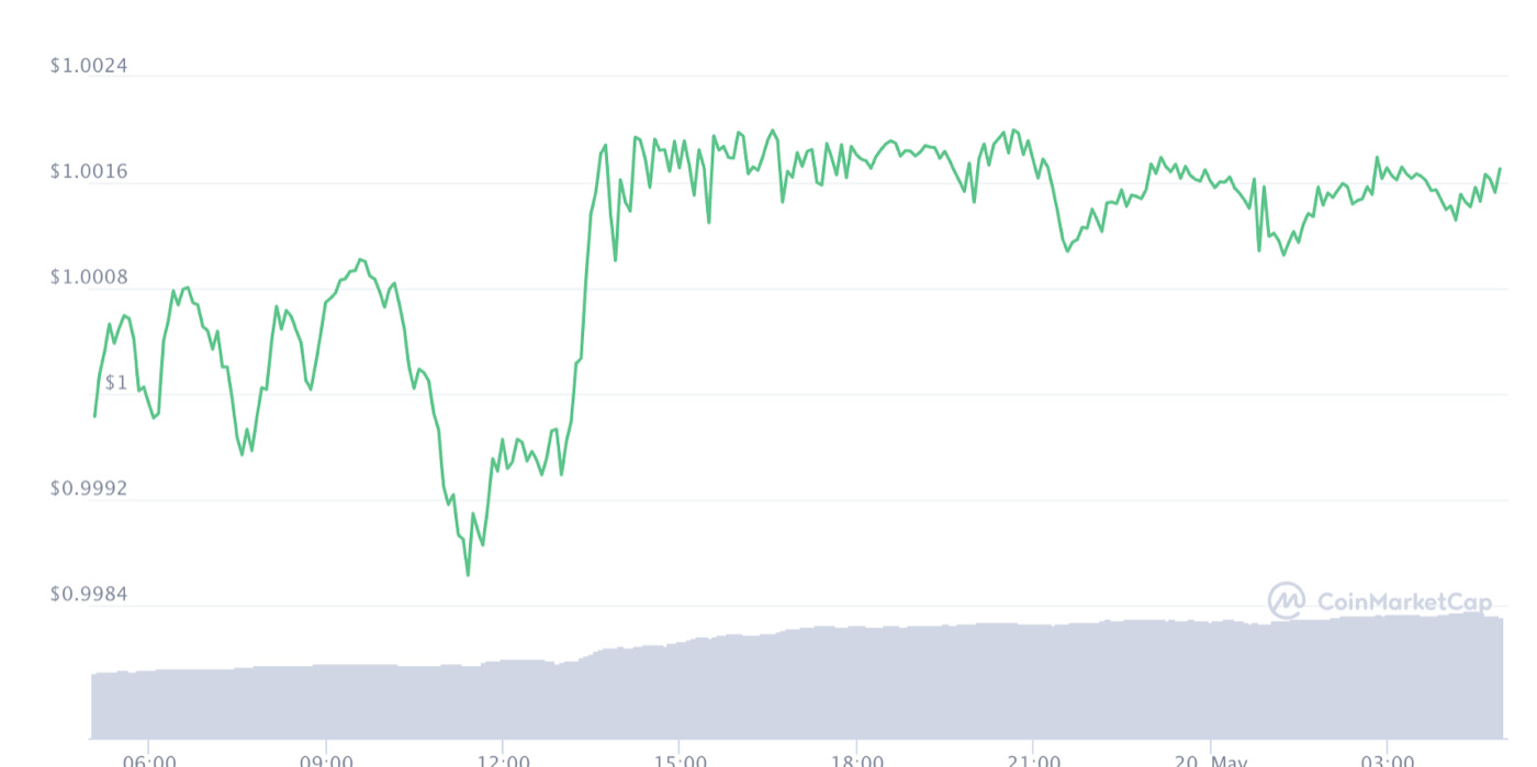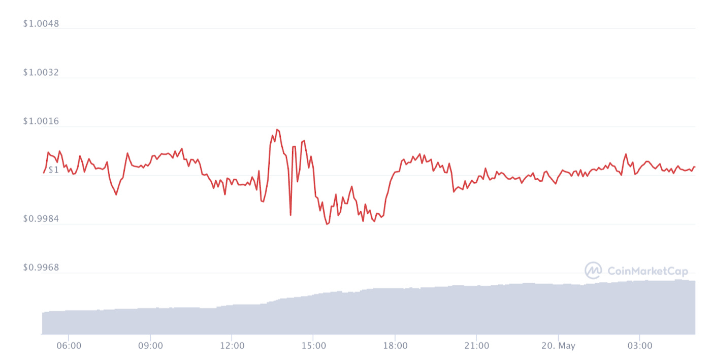 USDC, the coin backed by the Centre Consortium with fiat reserves, did slightly better, only hitting a peak of $1.0015 and dropping to $0.9985:
