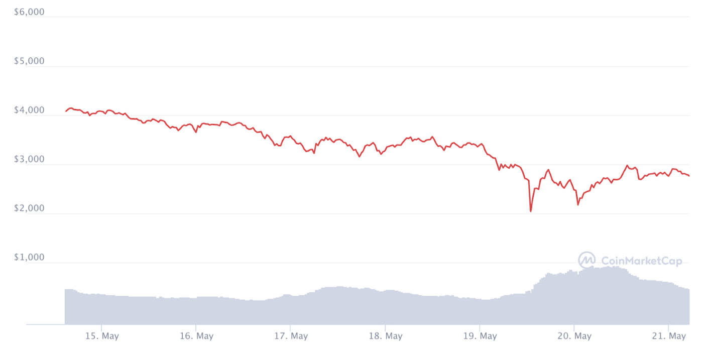 Overall the market dropped about 30% in a day, and while there's been some rebound (Bitcoin is currently at $40,000, Ethereum at $2,800), the market is certainly quite a bit lower than it was last week.